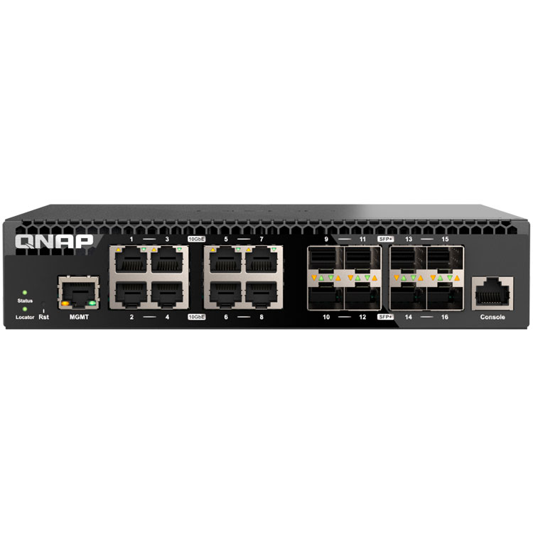 O QSW-M3216R-8S8T da Qnap é um switch gerenciável com 16 portas, sendo 8 portas SFP+ de 10GbE e 8 10GbE BASE-T (RJ45), além de uma porta RJ45 de 1GbE para gerenciamento.