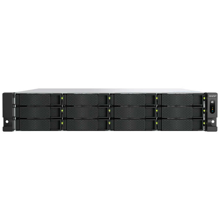 O TS-h1277AXU-RP é um storage NAS da Qnap que possui 12 baias hot swappable para instalação de drives SATA HDD/SSD, possibilitando até 240TB de capacidade bruta total.